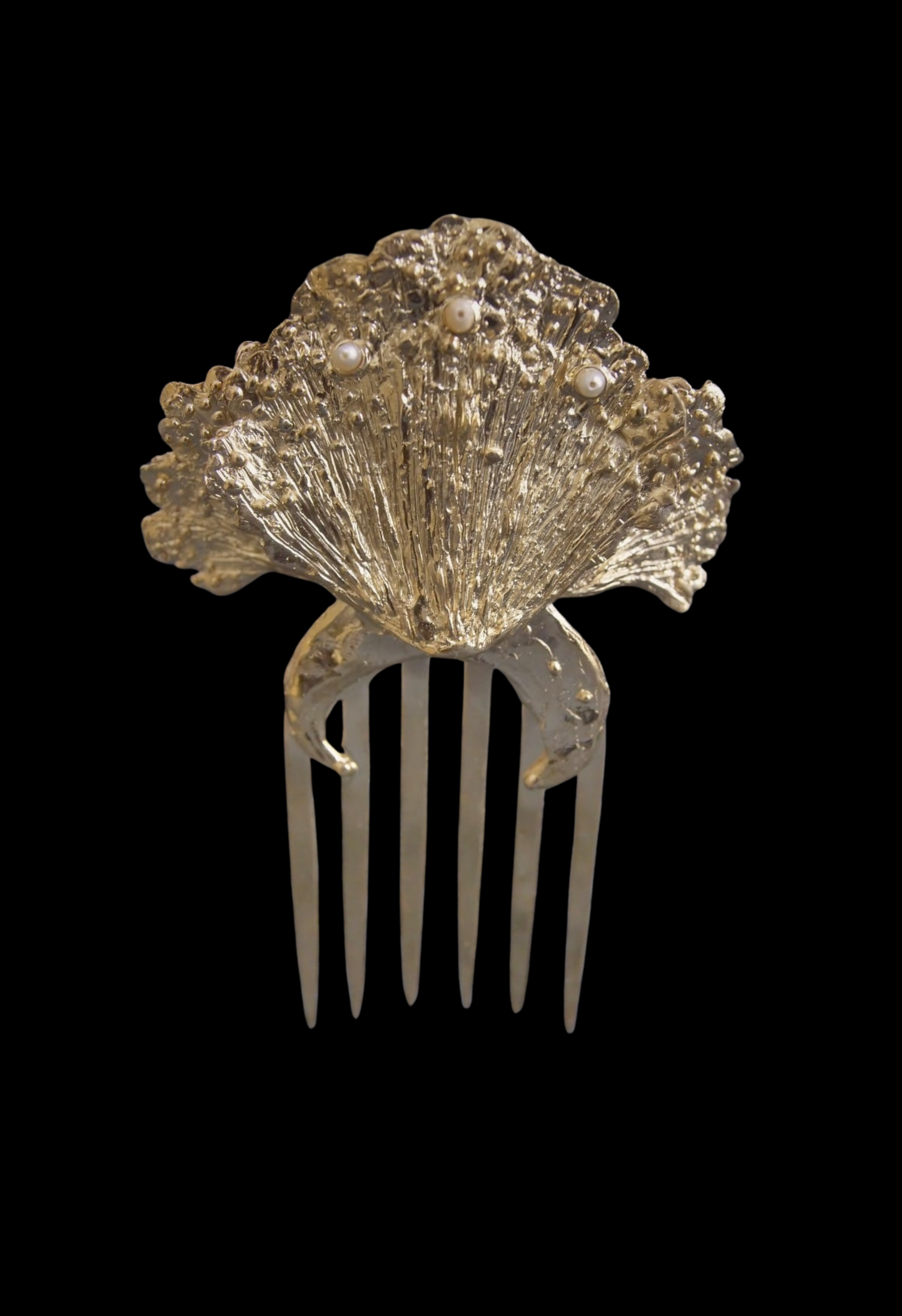 Cast bronze hair comb with 14k gold plating and fresh water pearls
